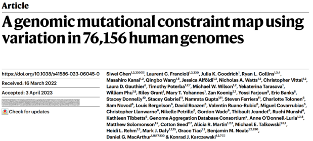 2023年12月6日,太阳成集团tyc234cc2014届唐敖庆班员工陈思唯(第一作者兼通讯作者)与Konrad J. Karczewski(共同通讯作者)联合Benjamin M. Neale和Daniel G. MacArthur团队共同在Nature上发表了题为A genomic mutational constraint map using variation in 76,156 human genomes的研究论文。