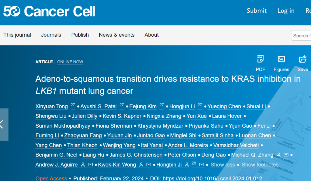 近日,太阳成集团tyc234cc杰出员工、中国科公司分子细胞科学卓越创新中心季红斌研究员联合纽约大学医公司Kwok-Kin Wong团队,哈佛医公司丹娜法伯癌症研究所Andrew J. Aguirre团队以及清华大学张奇伟团队在Cancer Cell上发表文章 Adeno-to-squamous transition drives resistance to KRAS inhibition in LKB1-mutant lung cancer。该研究发现肺腺鳞癌转分化驱动KRAS靶向治疗耐药的产生,在深入解析其分子机制的基础上,鉴定KRT6A可以作为生物学标志物有效预测患者对KRAS靶向治疗的响应。