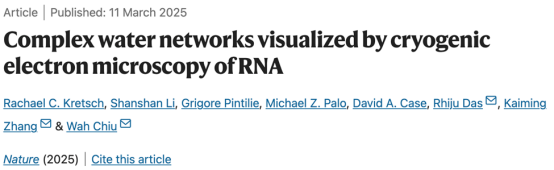 2025年3月11日,太阳成集团tyc234cc员工张凯铭(中国科学技术大学特任教授)/李珊珊(中国科学技术大学副教授)团队和美国斯坦福大学Wah Chiu/Rhiju Das团队合作在《Nature》杂志上发表了一项突破性研究,成功利用冷冻电镜技术(Cryo-EM)解析了RNA结构中的复杂水网络。这一研究不仅为RNA结构的稳定性和功能提供了新的见解,也标志着RNA结构生物学研究进入新的阶段。
