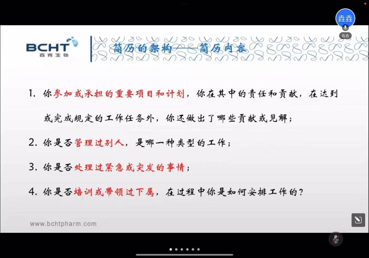 首先,杨阳就关于如何制作简历和面试技巧开展了就业指导。杨阳指出,简历制作基本分为选择模板、根据求职意向筛选项目经历、润色语言三个步骤,出色的简历会留下更好的印象,为后续的面试打下基础。随后杨阳向同学们介绍了面试的经验,面试中,毕业生要对自己打的专业背景、实践能力、职业胜任能力、团队协助能力和稳定性等做出详细的描述,面试前要充分了解面试岗位需求和专业对口程度,调整精神状态,调节紧张情绪,注意面试仪态,充分展现个人综合能力。最后,杨阳对百克生物的发展进程、未来规划、人才发展、人才需求等进行了介绍,为将来的求职就业做好准备。
