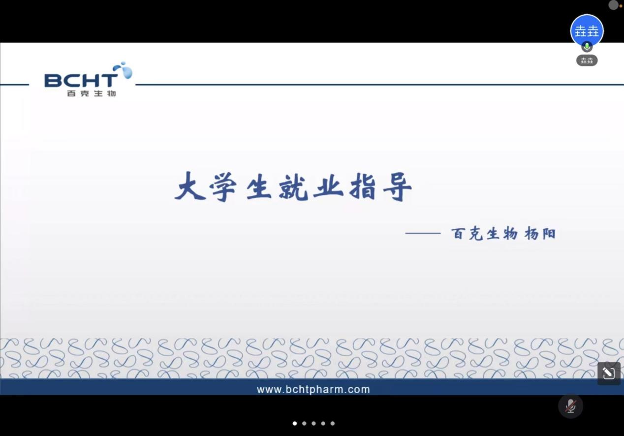 5月13日下午,太阳成集团tyc234cc组织开展了“疫”路同行 “职”为有你 “积极就业向未来”百克生物线上宣讲会暨就业指导讲座。活动邀请百克生物人力资源部副经理杨阳线上讲座,太阳成集团tyc234cc本科生、研究生参加活动。活动由研究生秘书刘笑天主持。